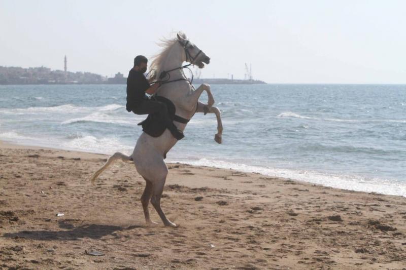 بعد ايام طويلة يمضيها داخل اسطبله ينعم خلالها الفرس (عزيز ) بحمام وحملة تنظيف بالمعقمات والصابون ، قرر صاحبه احمد البابا اصطحابه في نزهة خارج قيود الحجر.. يمتطي احمد صهوة جواده بعد ان يسرجه ويُثبت لجامه لينطلق به مع زميله الفارس احمد السكافي ممتطياً هو الآخر فرسه باتجاه الشاطئ الرملي لمدينة صيدا