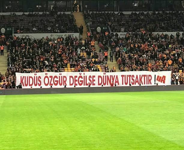 وخلال مباراة غالطة سراي أمام إسطنبول باشاك شهير التي أقيمت أمس الأربعاء، على ملعب "علي سامي يان الرياضي"، في ربع النهائي من مسابقة كأس تركيا، رفعت الجماهير من على المدرجات لافتة كبيرة على أحد جانبي الملعب، وكتبت عليها: "إذا لم تكن القدس حرة، فإن العالم أسير".