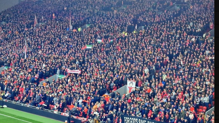وجهت جماهير ليفربول، رسالة دعم للشعب الفلسطيني في ظل الصراع الدائر بين الفلسطينيين والجيش الإسرائيلي في قطاع غزة، وذلك خلال لقاء "الريدز" ضد ضيفه إيفرتون يوم السبت.