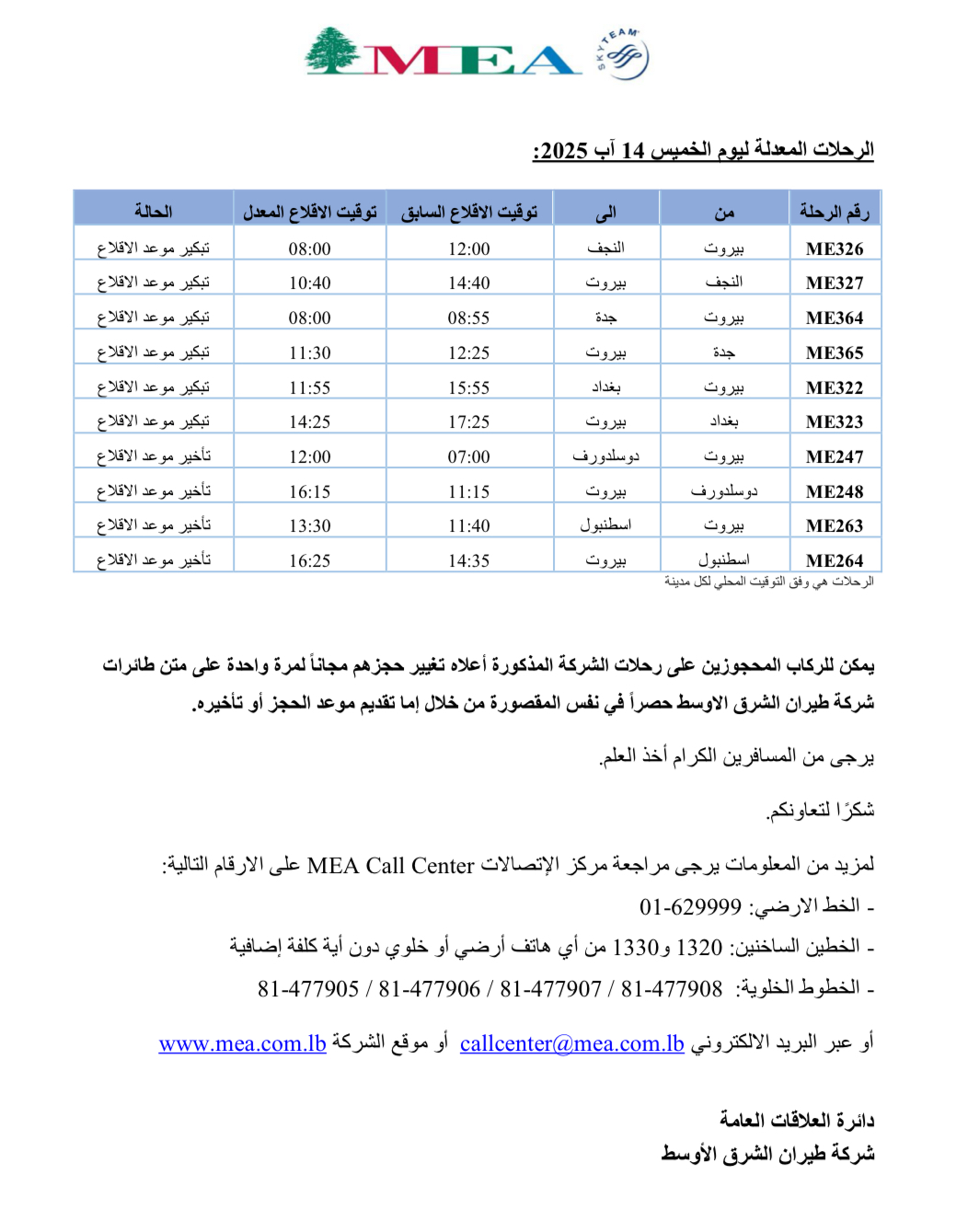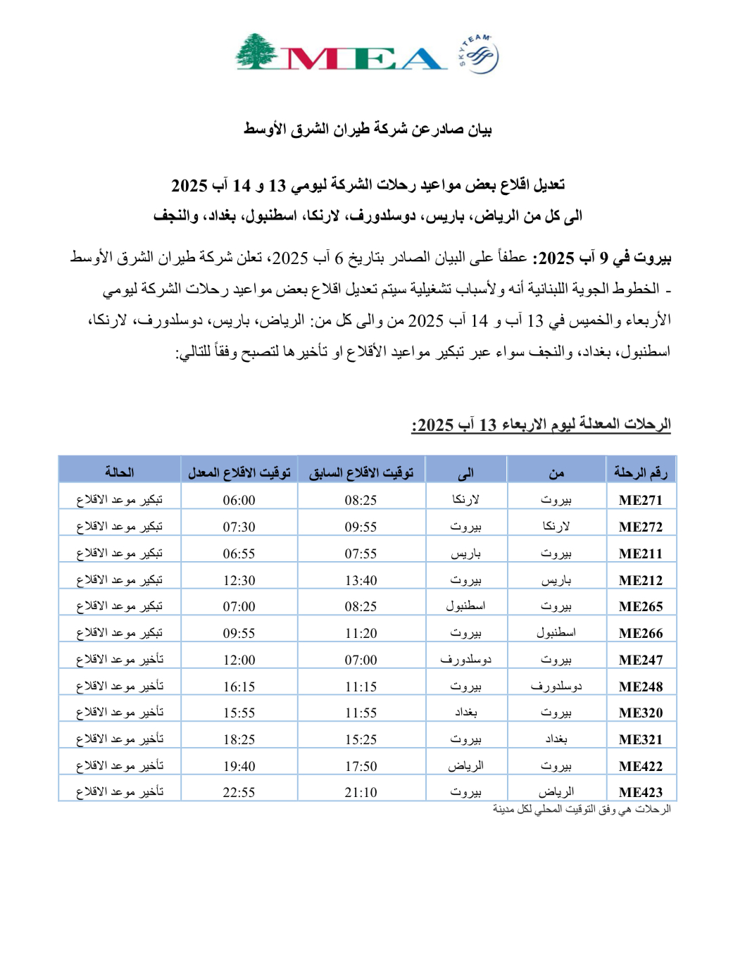 أعلنت شركة طيران الشرق الأوسط أنه ولأسباب تشغيلية، ستُعدَّل مواعيد إقلاع بعض رحلاتها من وإلى كل من الرياض، باريس، دوسلدورف، لارنكا، إسطنبول، بغداد، والنجف، يومي الأربعاء والخميس 13 و14 آب 2025، وذلك إما بتبكير موعد الإقلاع أو تأخيره، وفق الجدول الجديد المعلن من قبل الشركة.