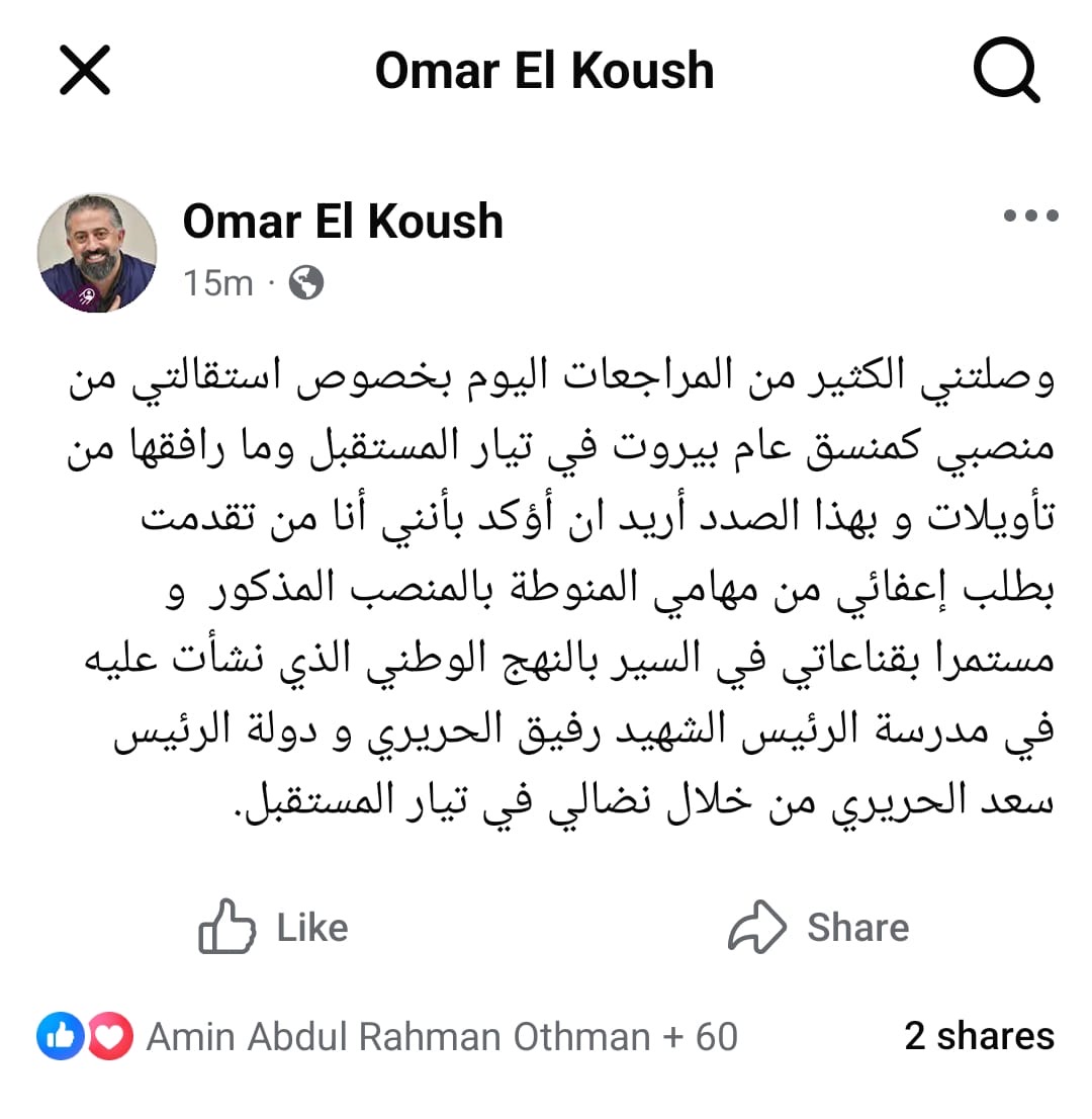 علق المحامي عمر الكوش على ما وصله من "مراجعات بخصوص استقالته من منصبه كمنسق عام بيروت في تيار المستقبل، وما رافقها من تأويلات"، بالقول عبر منشور على وسائل التواصل الاجتماعي، مساء اليوم :"أريد ان أؤكد بأنني أنا من تقدمت بطلب إعفائي من مهامي المنوطة بالمنصب المذكور ، و مستمر بقناعاتي في السير بالنهج الوطني الذي نشأت عليه في مدرسة الرئيس الشهيد رفيق الحريري و دولة الرئيس سعد الحريري من خلال نضالي في تيار المستقبل".