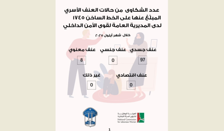 أفادت الهيئة الوطنية لشؤون المرأة اللبنانية، في بيان "عدد الشكاوى من حالات العنف الأسري المبلغ عنها على الخط الساخن 1745 لدى المديرية العامة لقوى الأمن الداخلي لشهر أيلول 2025، جاء على الشكل التالي: