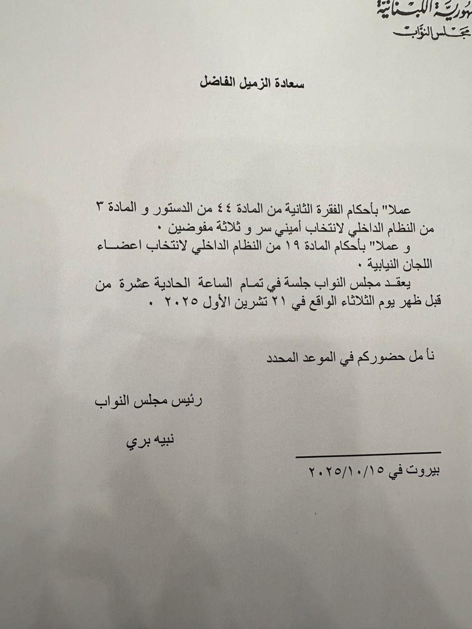 يدعو رئيس مجلس النواب نبيه بري إلى عقد جلسة عامة لإنتخاب أميني سر و3 مفوضين وأعضاء اللجان النيابية الساعة 11 قبل ظهر الثلاثاء المقبل.
