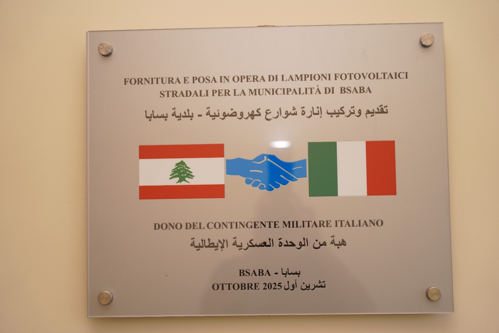 أقامت بلدية بسابا - الشوف، حفل إزاحة الستار عن اللوحة التذكارية تكريمًا للبعثة الثنائية العسكرية الإيطالية في لبنان "MIBIL"، في مبنى القصر البلدي، حيث تم التوقيع على تقدمة هبة ما بين العقيد فيتوريو جيسوني، قائد البعثة العسكرية الثنائية الإيطالية في لبنان ونائب رئيس اتحاد بلديات اقليم الخروب الجنوبي - رئيس بلدية بسابا الشوف، الأستاذ جمال سالم العاكوم.