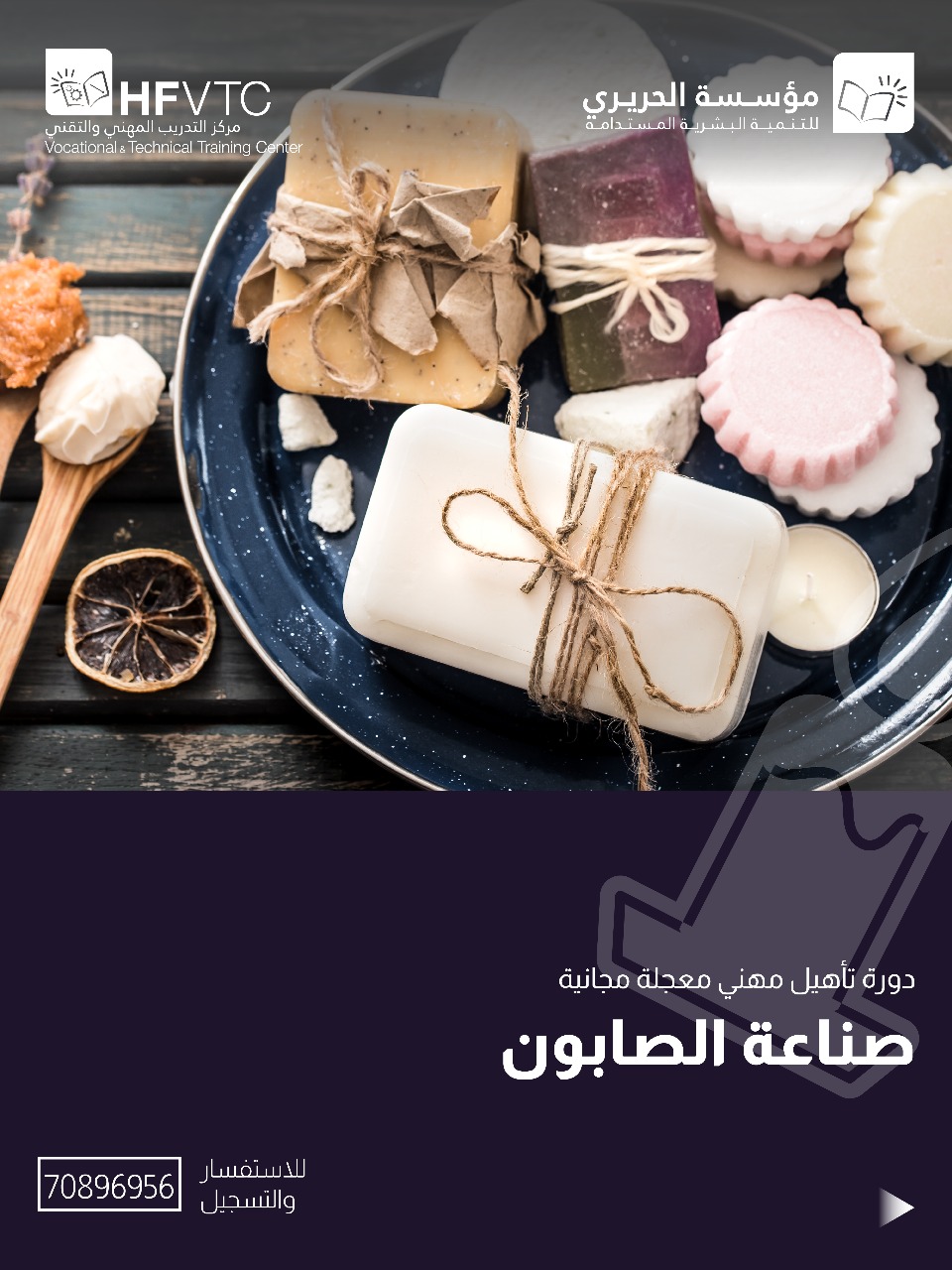 * صناعة الصابون: يتعرّف المتدرّب على مكوّنات الصابون وأنواعه، وطريقة وزن وخلط المواد، وخطوات صناعة الصابون المنزلي واستخدام القوالب مع مراعاة قواعد السلامة.