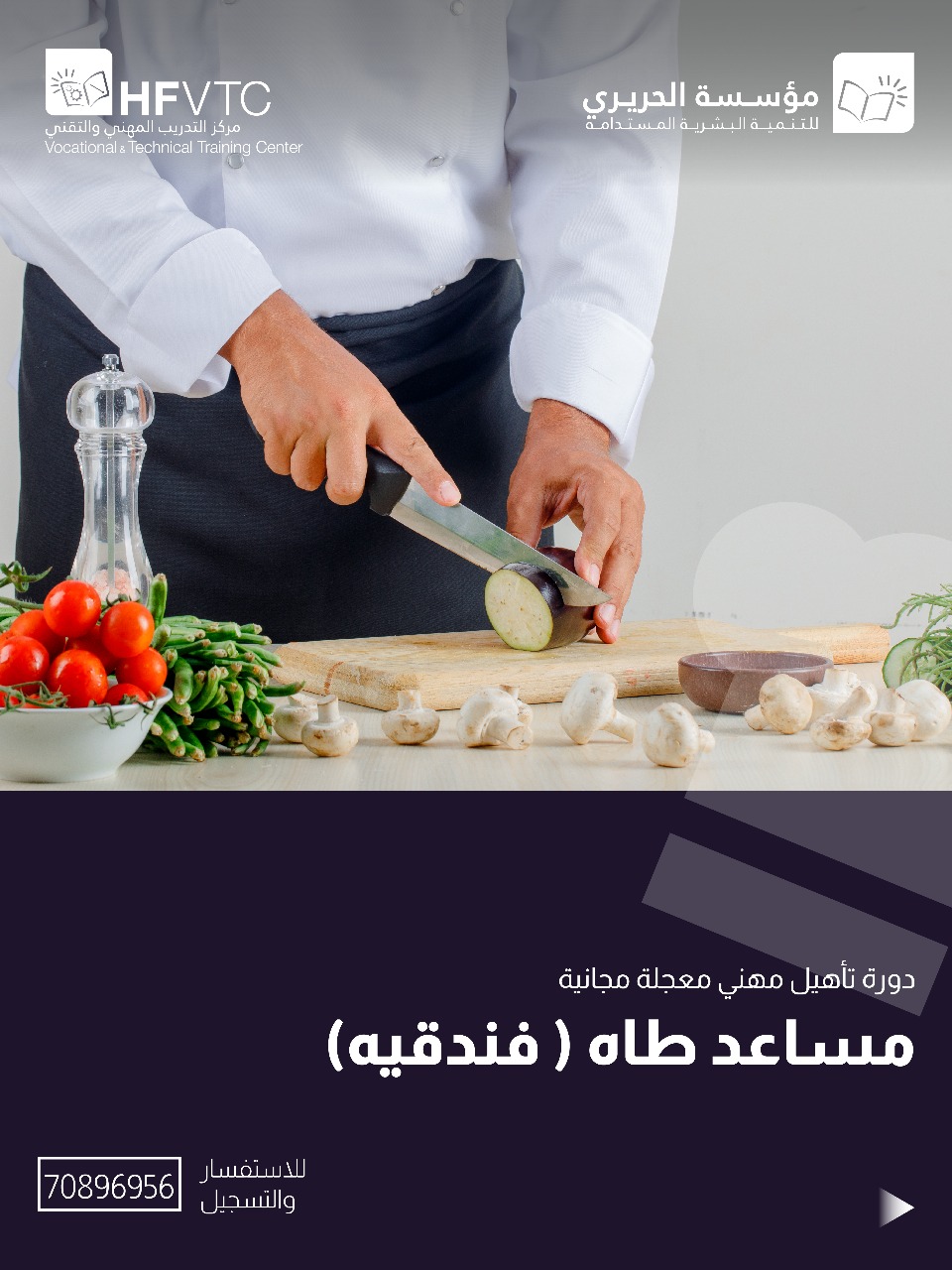 * مساعد طاهٍ (فندقية): يتعرّف المتدرّب على أساسيات تنظيم المطبخ الفندقي، وقواعد النظافة والسلامة الغذائية، وطريقة تجهيز المواد الأولية والمساعدة في إعداد الأطباق الغربية والشرقية.
