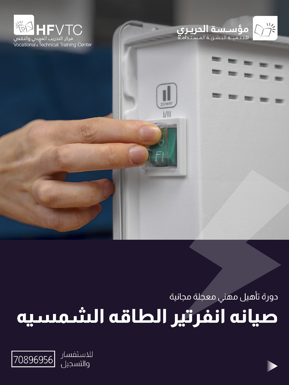 * صيانة إنفرتر الطاقة الشمسية: يتعلّم المتدرّب مبدأ عمل إنفرتر الطاقة الشمسية، وطريقة توصيله بالنظام، وتشخيص الأعطال الشائعة واستخدام أجهزة القياس الأساسية في الصيانة.