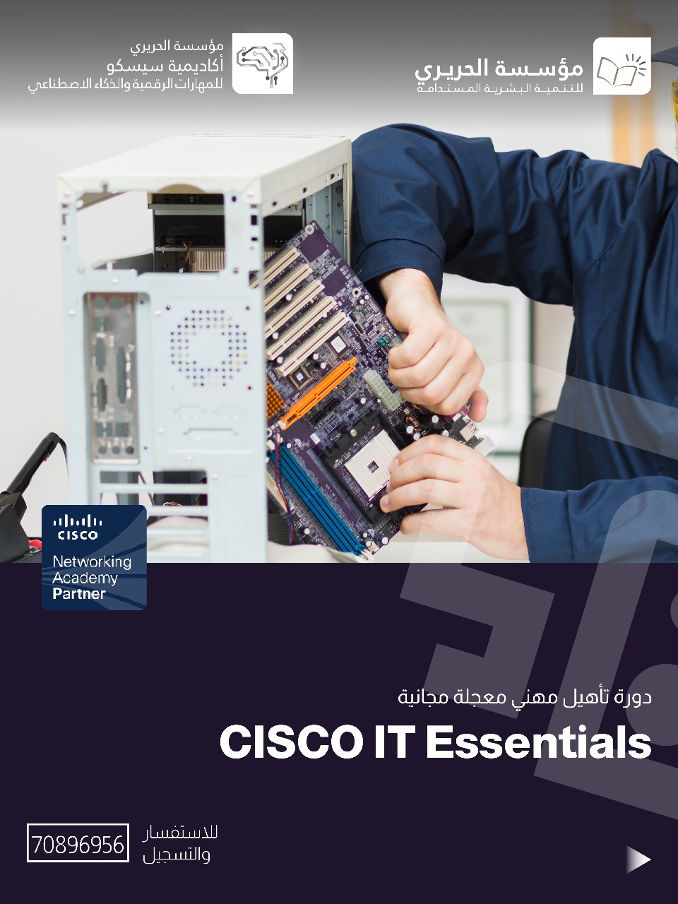 * "Cisco ITE" : يتعرّف المتدرّب على مكوّنات الحاسوب الداخلية والخارجية، وخطوات تركيب نظام التشغيل، وأساسيّات الشبكات واستكشاف الأعطال البسيطة في الحاسوب والشبكة.