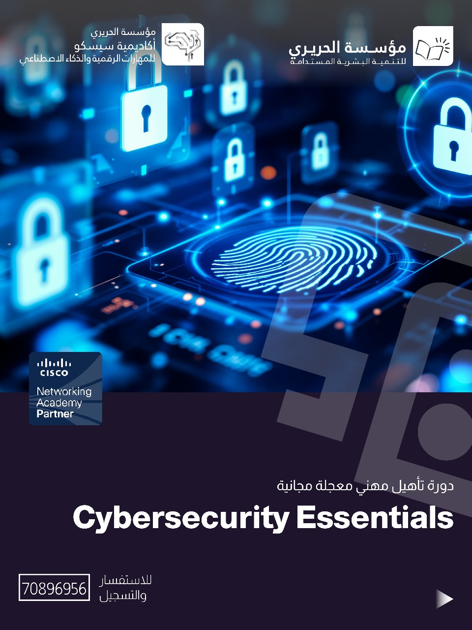 * "Cybersecurity Essentials " (أساسيات أمن المعلومات): يتعلّم المتدرّب مبادئ تأمين الشبكات والأجهزة، وطرق إنشاء كلمات مرور قوية، والتعامل الآمن مع البريد الإلكتروني والإنترنت، إضافةً إلى أساسيات كشف الهجمات الشائعة وطرق الحدّ من مخاطرها.