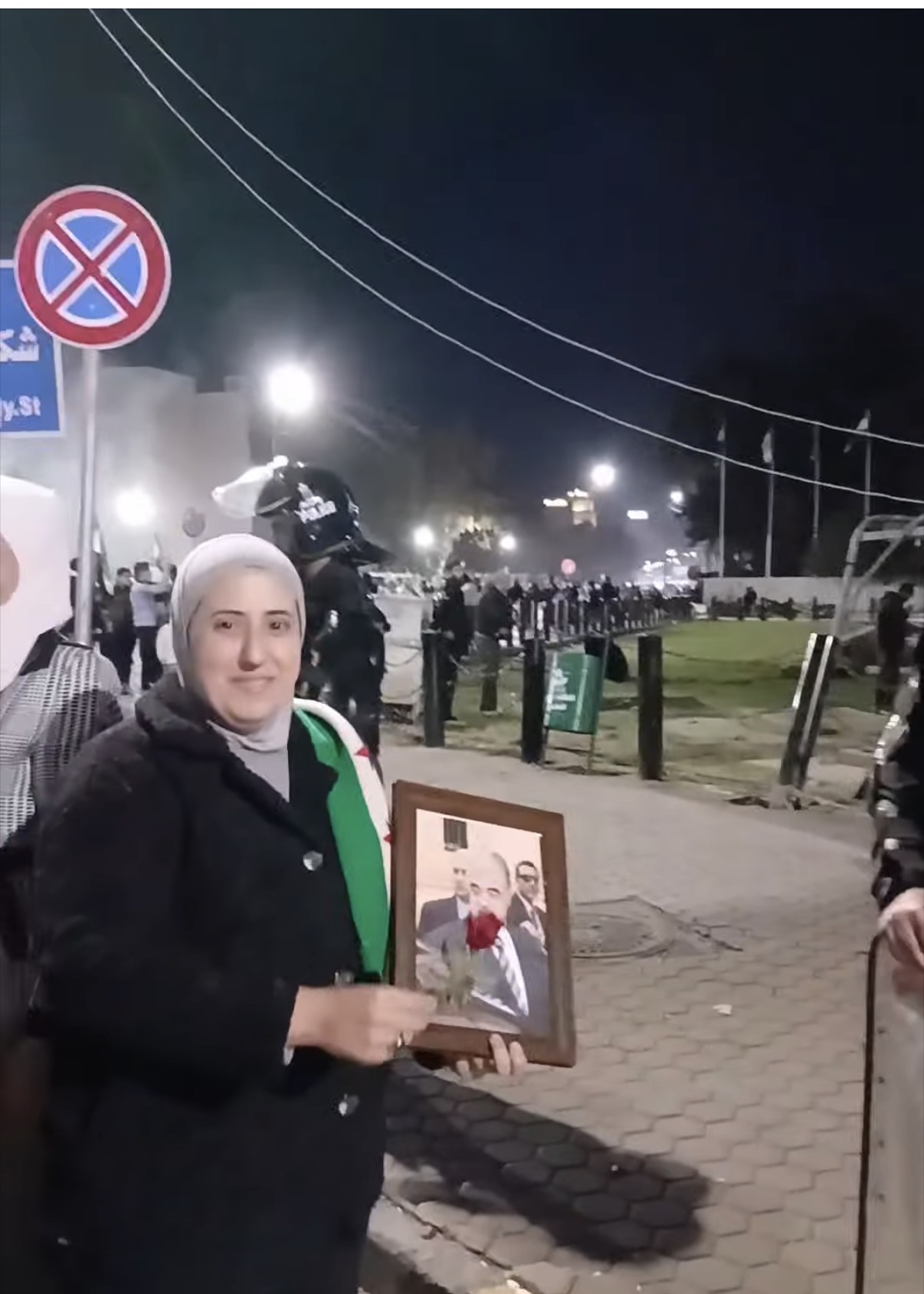 رفعت الناشطة إسراء حجازي صورة الرئيس الشهيد رفيق الحريري وسط ساحة الأمويين في دمشق خلال الاحتفال بذكرى تحرير سوريا وسقوط نظام بشار الأسد.