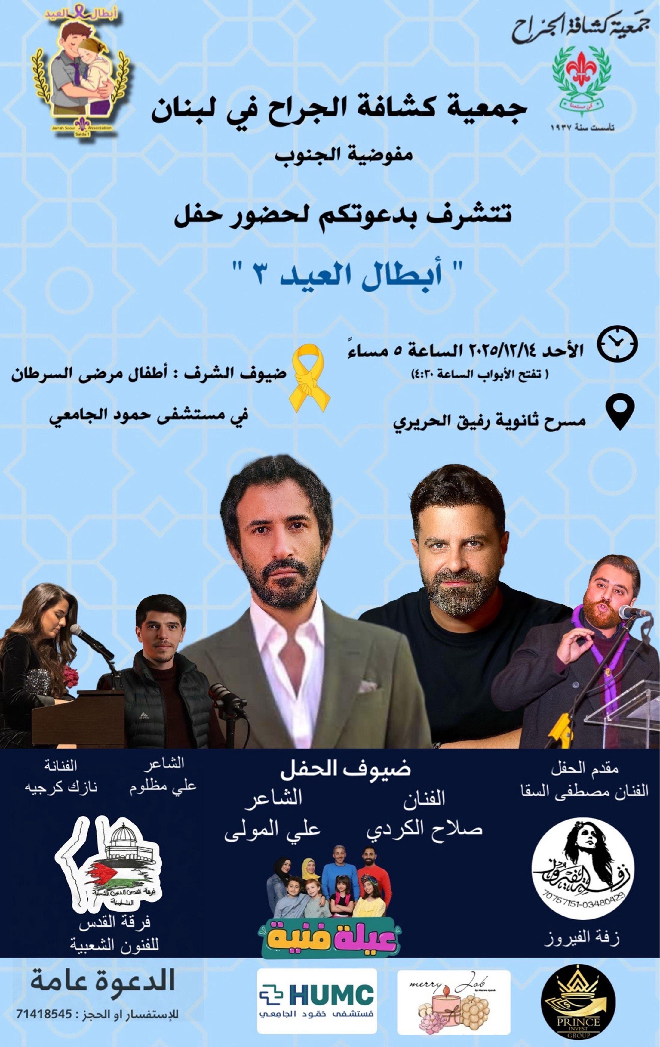 لمناسبة حلول الأعياد المجيدة، وللسنة الثالثة على التوالي تقيم "جمعية كشافة الجراح في لبنان – مفوضية الجنوب" بالتعاون مع مستشفى حمود الجامعي حفلاً ترفيهياً خاصاً بالأطفال مرضى السرطان تحت عنوان " أبطال العيد" .