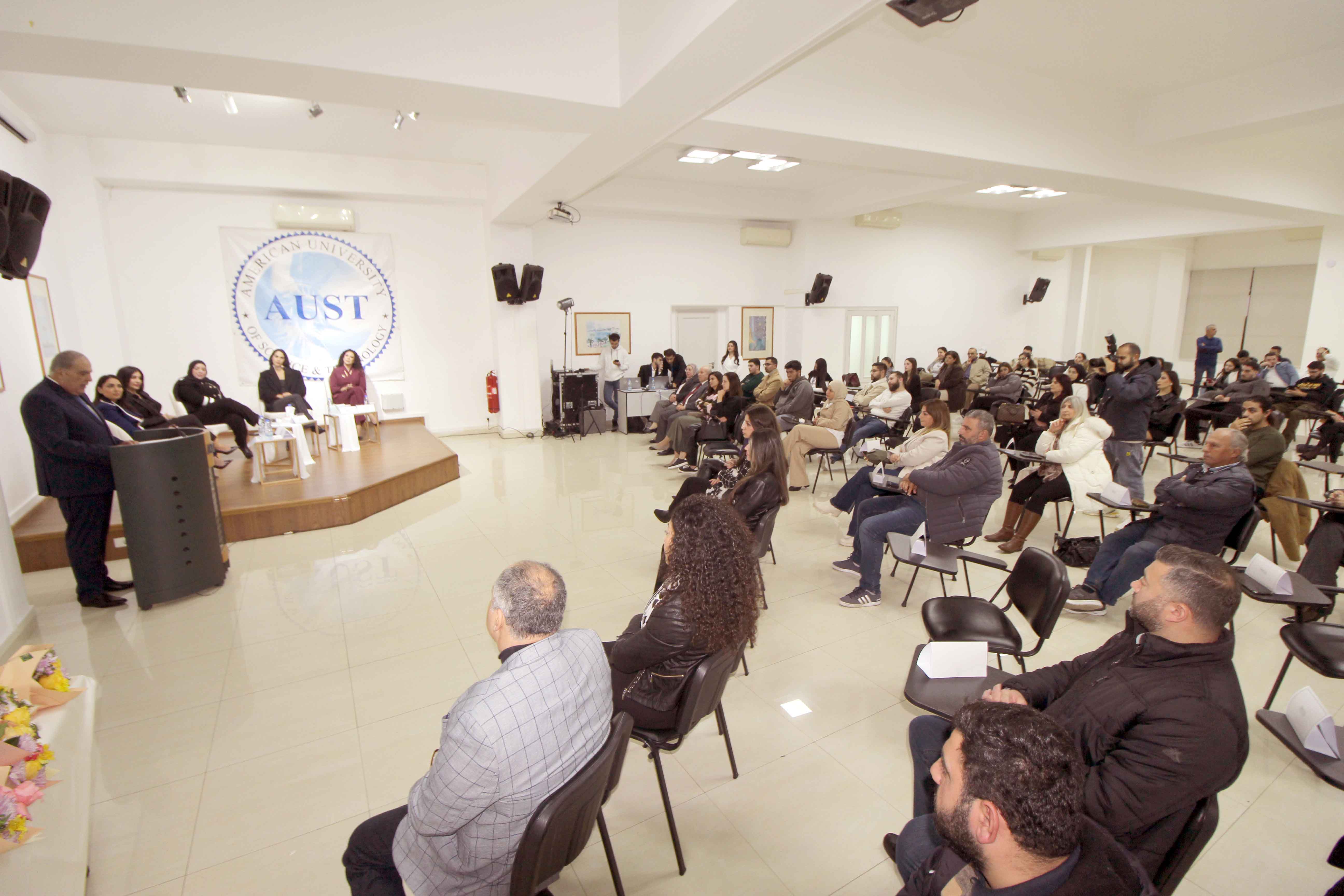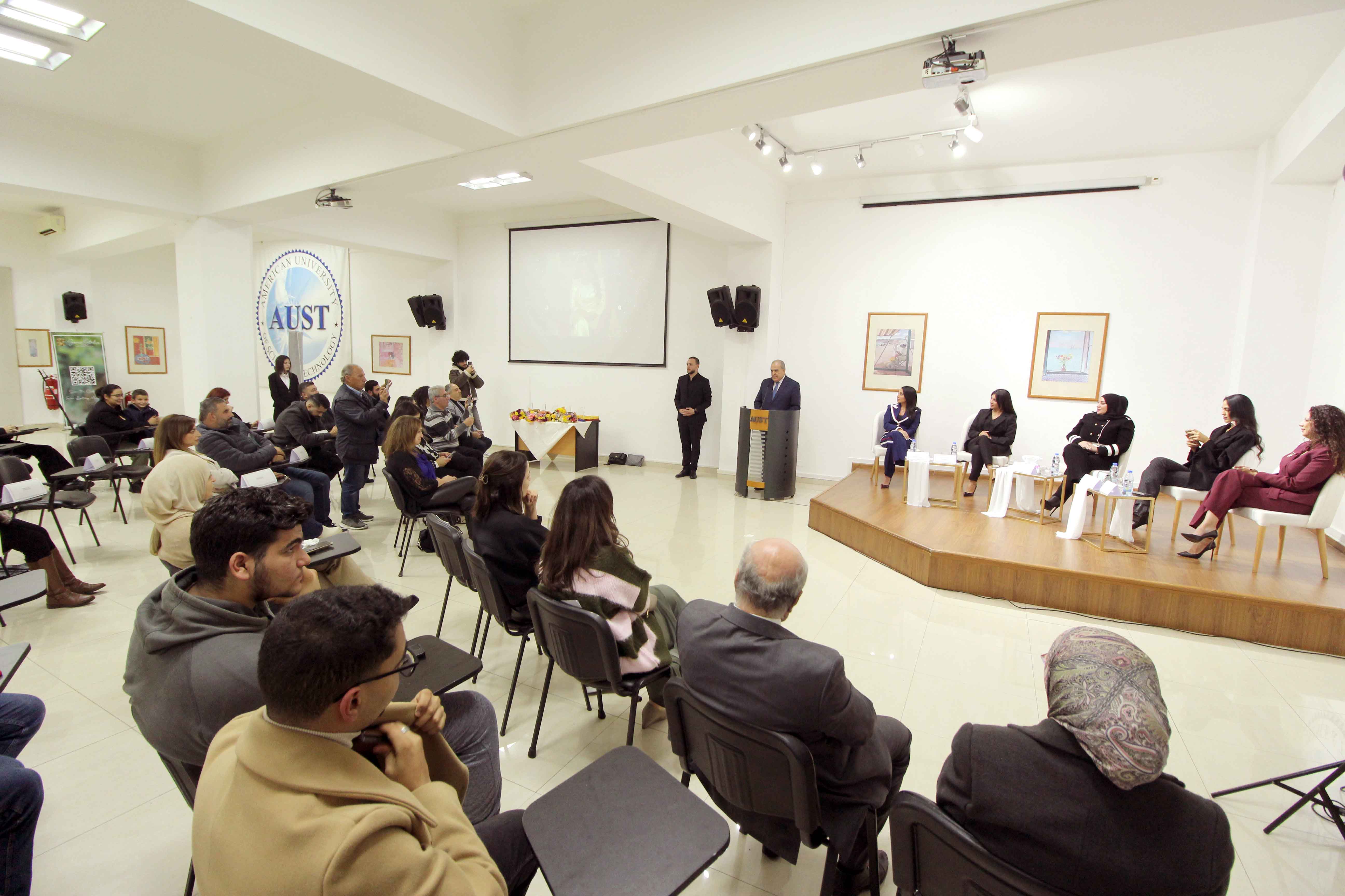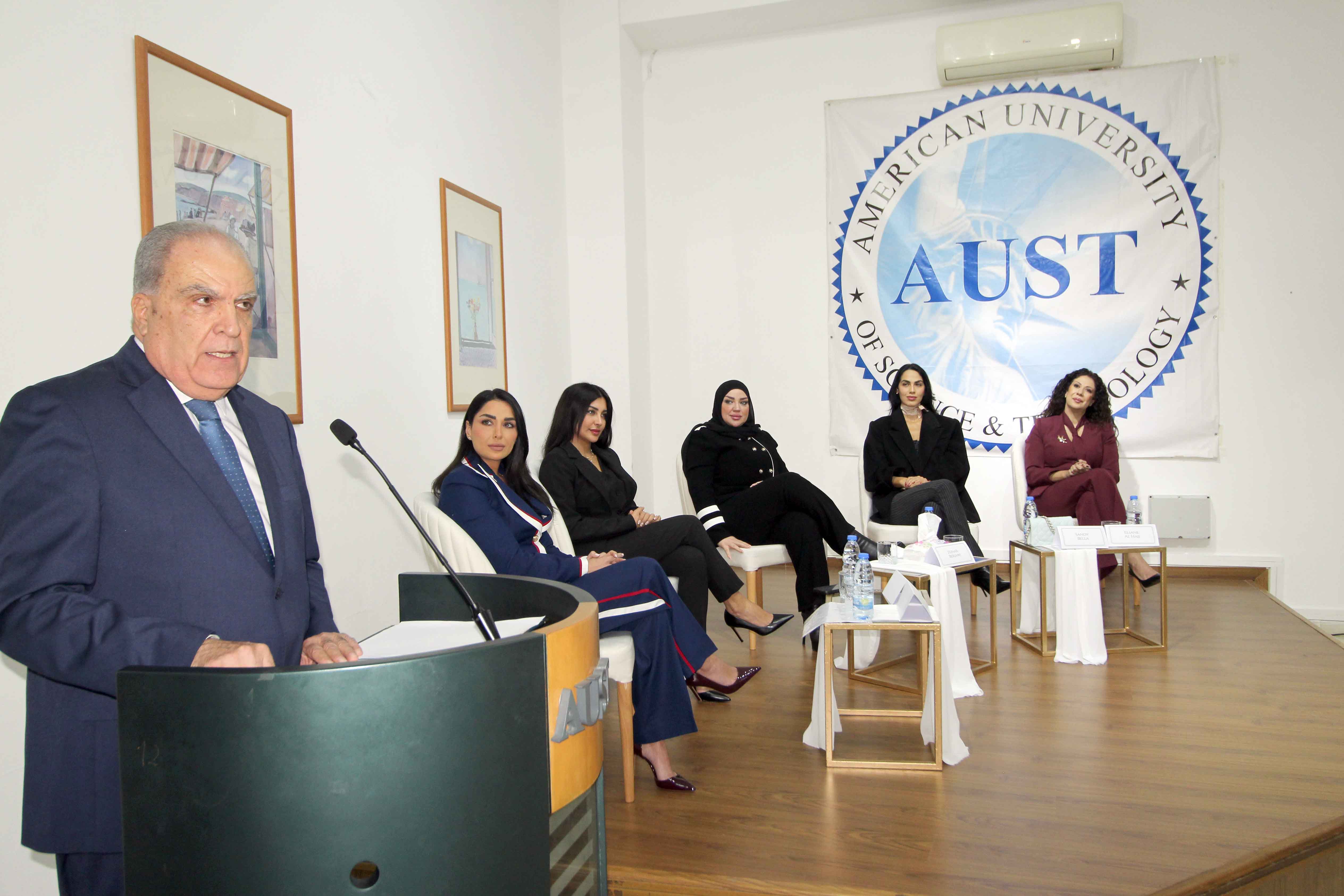 استهل الإحتفال بالنشيد الوطني اللبناني، ثم كان تقديم وترحيب من الطالبين علي عيسى وليساندرا سلمان، ألقى بعدها كلمة جامعة AUST ، مدير فرع صيدا الدكتور جورج فرحة فطلب بداية الوقوف دقيقة صمت تحية لروح الرئيسة الأم المرحومة الدكتورة هيام صقر ( مؤسسة الجامعة الاميريكية للعلوم والتكنولوجيا). وقال: هذا الإحتفال يَحملُ طابِعًا استثنائيًا بالنسبة لي شخصياً ولنا جميعاً في الجامعة الأميركية للعلوم والتكنولوجيا.AUST فاليومَ لا نحتفي فقط بنجاحِ نساءٍ مُبدعات، بل نحتفلُ بِخريجاتٍ صَنعنَ مسيرَتَهُن خُطوةً خُطوة، وكتبنَ قِصصًا مُلهمة تُشرِفُ الجامعة وتُشرِّفُ لبنان. نكرّمَ خمسِ طالباتٍ سيدات ترَكنَ بصمةً حقيقية في مسيرَتِهِنَ المهنية، وحققنَ حُضورًا متألقًا في مَجالات الإعلام والفن والظهور العام. سيداتٍ أثبتنَ أن النجاحَ ليس حُلُمًا بعيدًا، بل إِمكانيةً حقيقيةً عندما تَقتَرنُ المَوهِبة بالجدّيةِ والإِصرار.