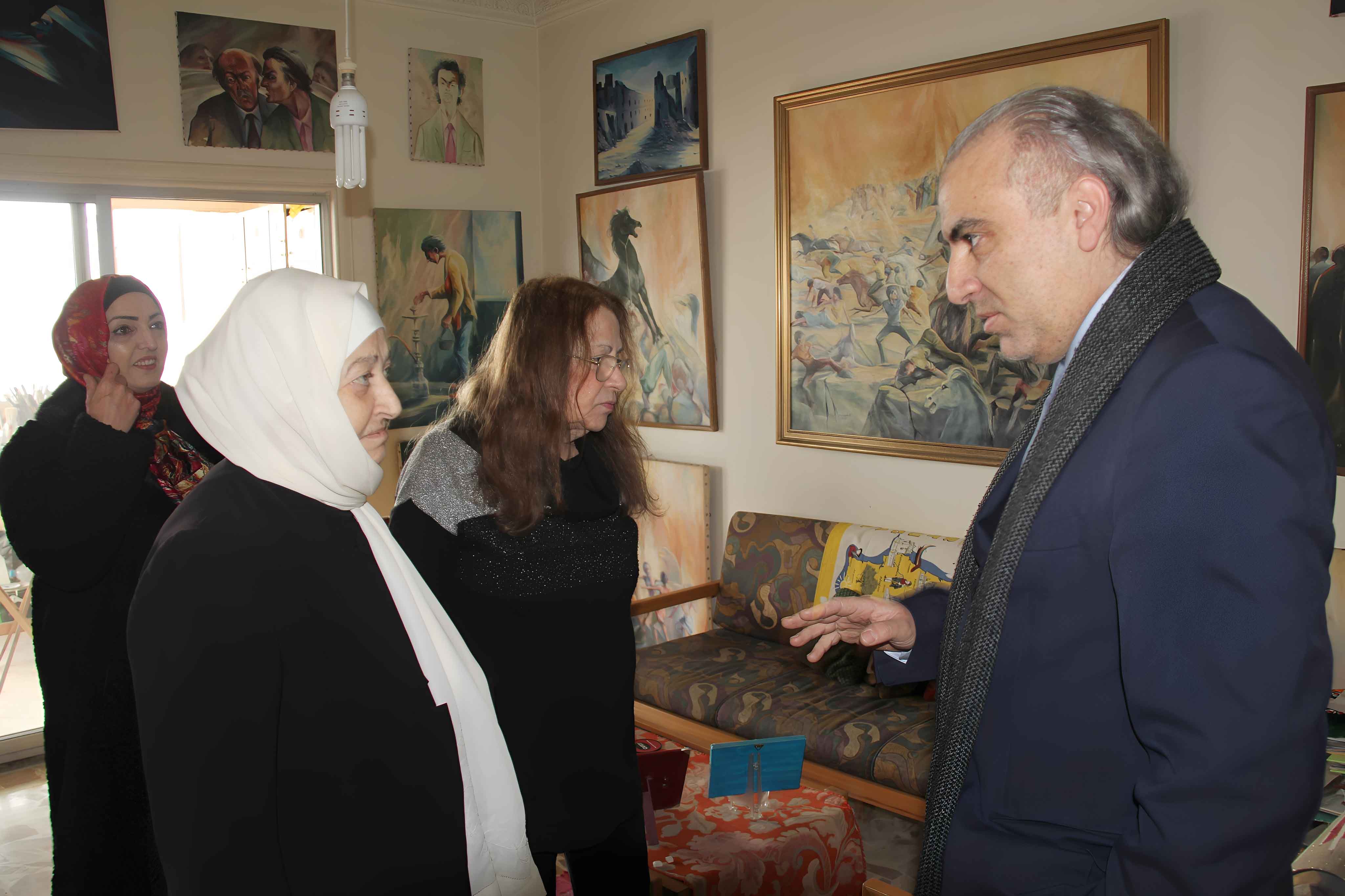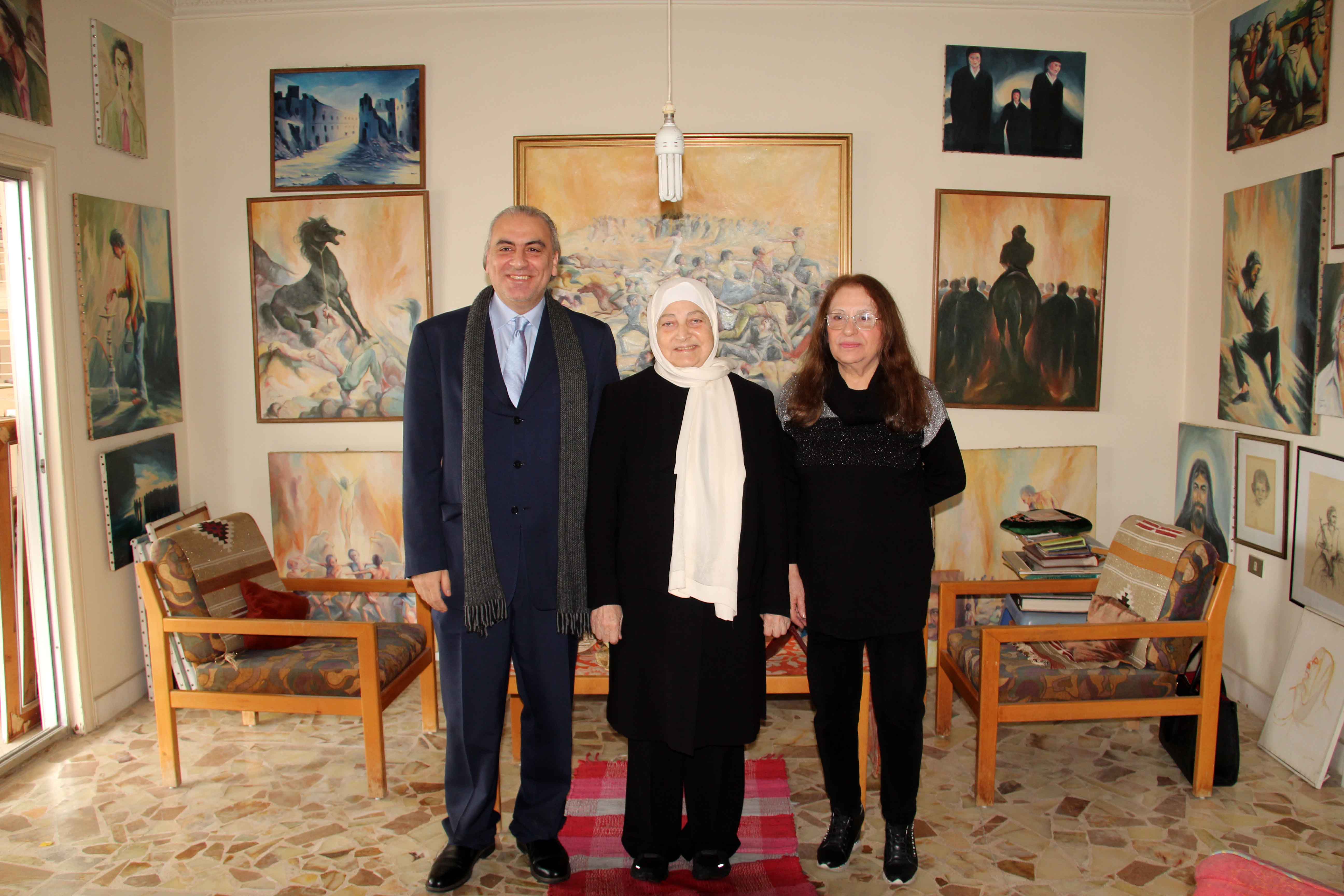 وكان في استقبال الحريري زوجة الفنان الراحل الخطيب الدكتورة ذكاء الحر ونجله الدكتور اياد الخطيب، حيث جالت برفقتهما في أرجاء المرسم الذي يضم مئات اللوحات الفنية من أعمال الفنان الراحل ، والتي تجسّد بالريشة واللون والفكرة أحداثاً ومراحل وحقبات وشخصيات عايشها، حيث كانت مناسبة لإستحضار مسيرة الراحل الفنية والأدبية وما تركه من بصمة ومدرسة متميزة في الفن التشكيلي كما في الشعر والكتابة .