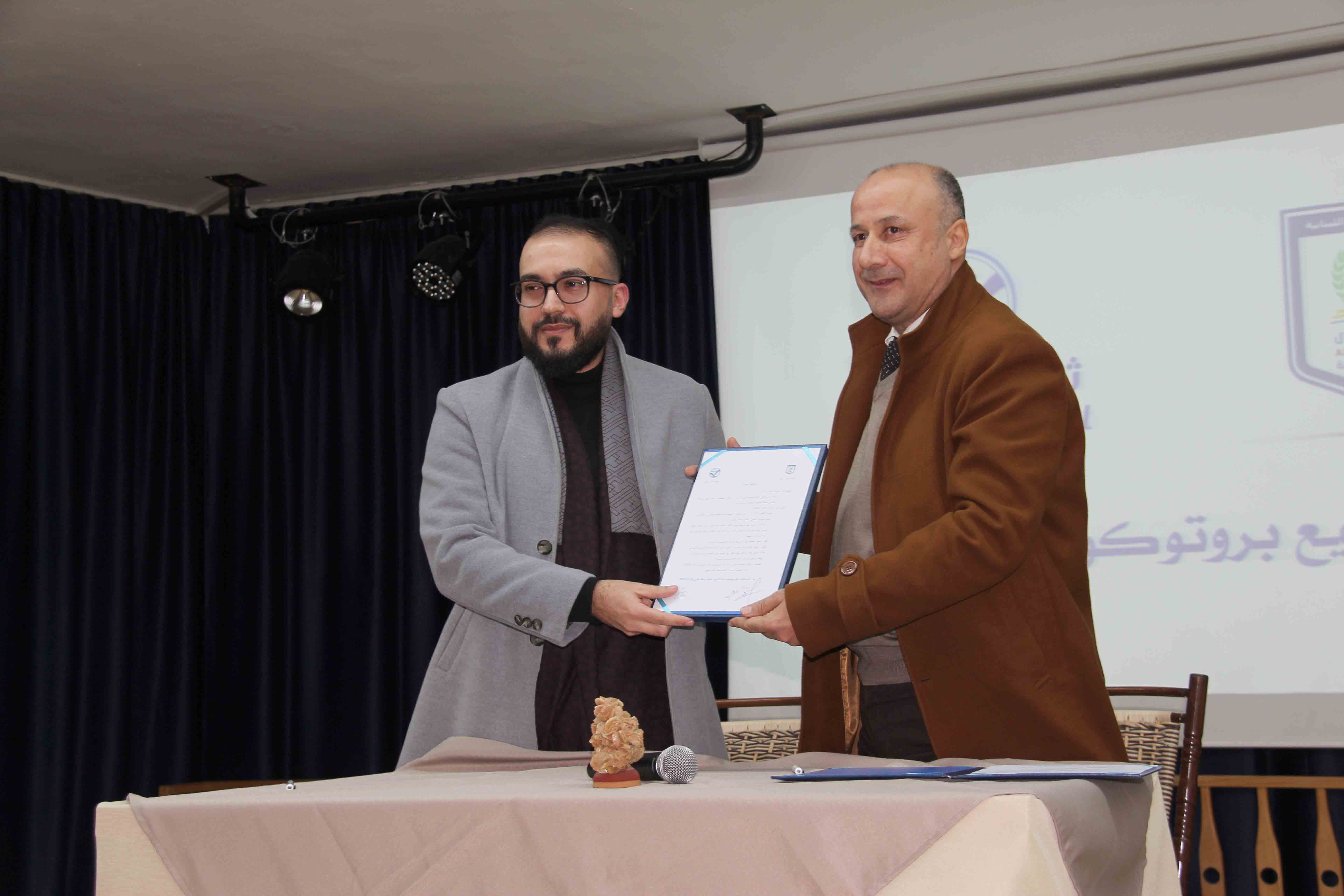 ثم قام كل من الدكتور حرب والدكتور ناصر الدين بتوقيع بروتوكول التعاون بين المدرستين. واختتم الحفل بتبادل التكريم والهدايا التذكارية .