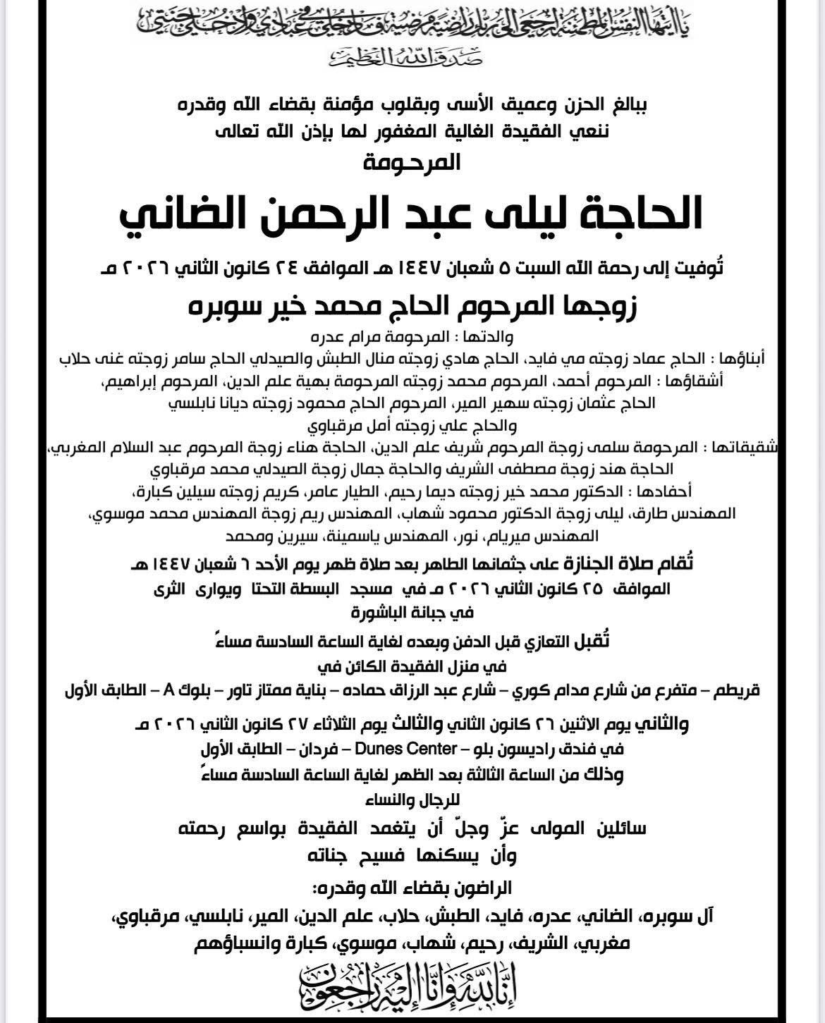 تتقدّم منسّقية بيروت في "تيار المستقبل" بخالص التعازي وأصدق مشاعر المواساة إلى الدكتور سامر سوبره (المنسق العام السابق لبيروت ) بوفاة والدته المغفور لها بإذن الله الحاجة ليلى عبد الرحمن الضاني،