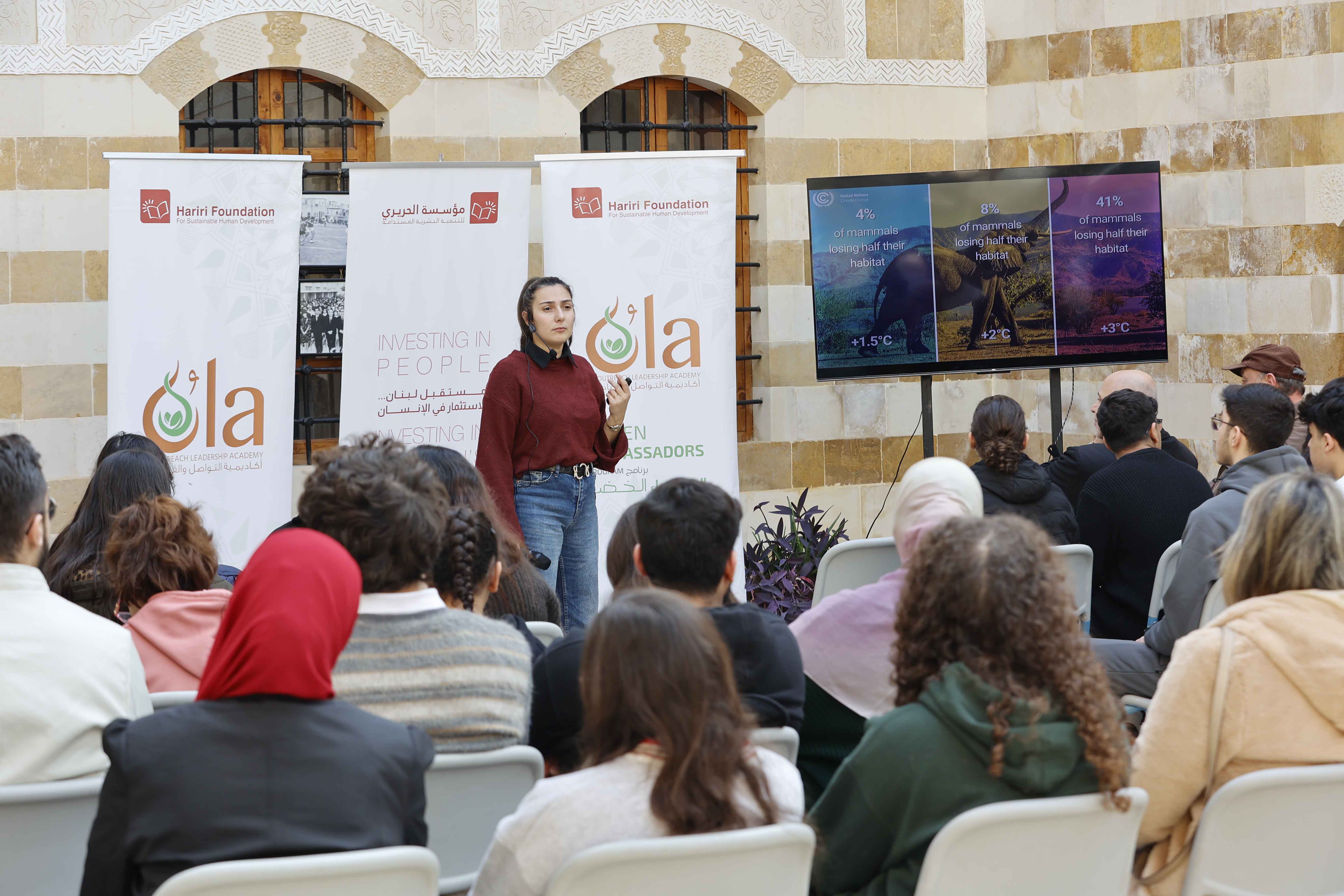 شارك في الورشتين اللتين نُظمتا على مدى يومين في أكاديمية التواصل والقيادة (OLA) في صيدا القديمة، أعضاء المجالس التنفيذية لـ"أندية السفراء الخضر". واستهدف البرنامج التدريبي 120 طالباً و20 مشرفًا بيئياً من 20 مدرسة، وركّز على رفع الوعي حول تغيّر المناخ، من خلال محاور أساسية شملت "التخفيف من تأثيرات التغيّر المناخي والتكيّف معه، الإستهلاك والإنتاج المستدامين والدائرية، المواطنة البيئية الفاعلة، والتفكير الإبداعي وحلّ المشكلات، ومهارات التواصل وبناء الفريق".