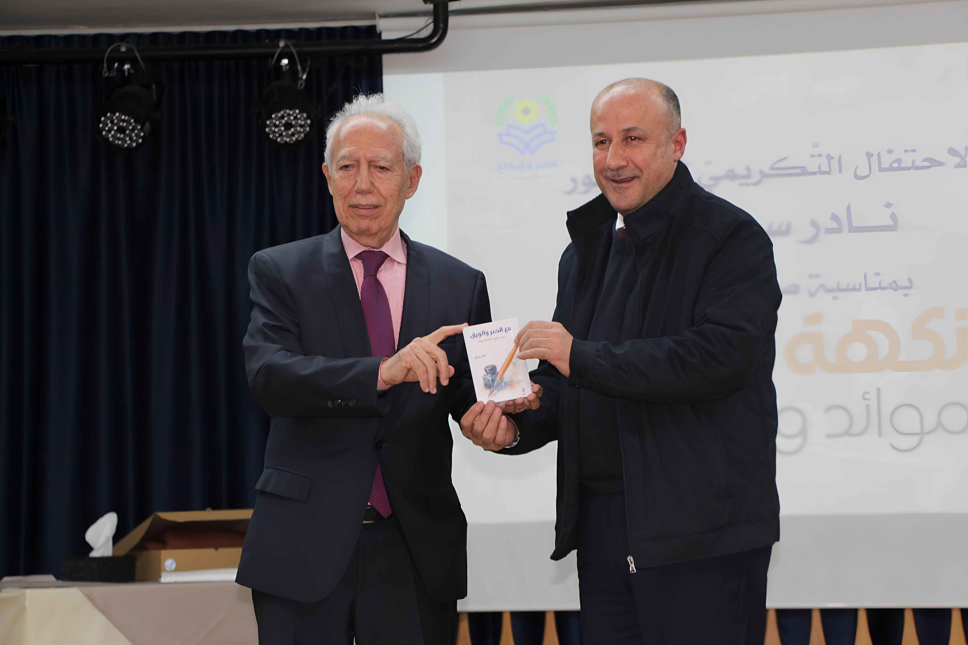 وتحدث المحتفى به الدّكتور نادر سراج ، فشكر أسرة ثانوية السفير على هذا التكريم ، وقال: " ضُرِبَ الموعدُ في غازيّة الجنوب والقلوب، وانعقد الشملُ في ثانوية السفير المتألقِة ثقافةً ومعرفةً وعلومًا تربويةً رائدة، والعامرِة نشاطًا بهمّة القيمين عليها، وفي مقدمهم الصديق، وآخر الأوفياء، الدكتور سلطان ناصر الدين. جمعتنا الأقدارُ ودروب المعرفة فبات سلطانُ منّي بقدر ما أنا منه. قرأنا في كتاب واحد، فوجدنا أن تاريخَنا ودروبَنا وانشغالاتنا واحدة، نفاخر بها لأنها مُضَمَّخة بإشراقاتِ فكرية، ومرصَّعة بتوهُّجاتٍ معرفية، ومُكلّلة بتطواف تربوي مجبول بالكدِّ والجِدِّ، بالبحثِ والسَّعي وبالعَرَقِ والسَّهَر. معًا تآزرنا لخوضِ بحوره، وصوغِ فصوله، وتجويدِ مقالاتِه. ولنا ملءُ الثقة في أن يقطفَ جيلُكم ثمارًا أينعت بائتلاف تضحيات الأهل وإسهامات الثانوية وثلاثية الفكر والحبر والورق، زادنا وخبزنا كفاف يومنا".