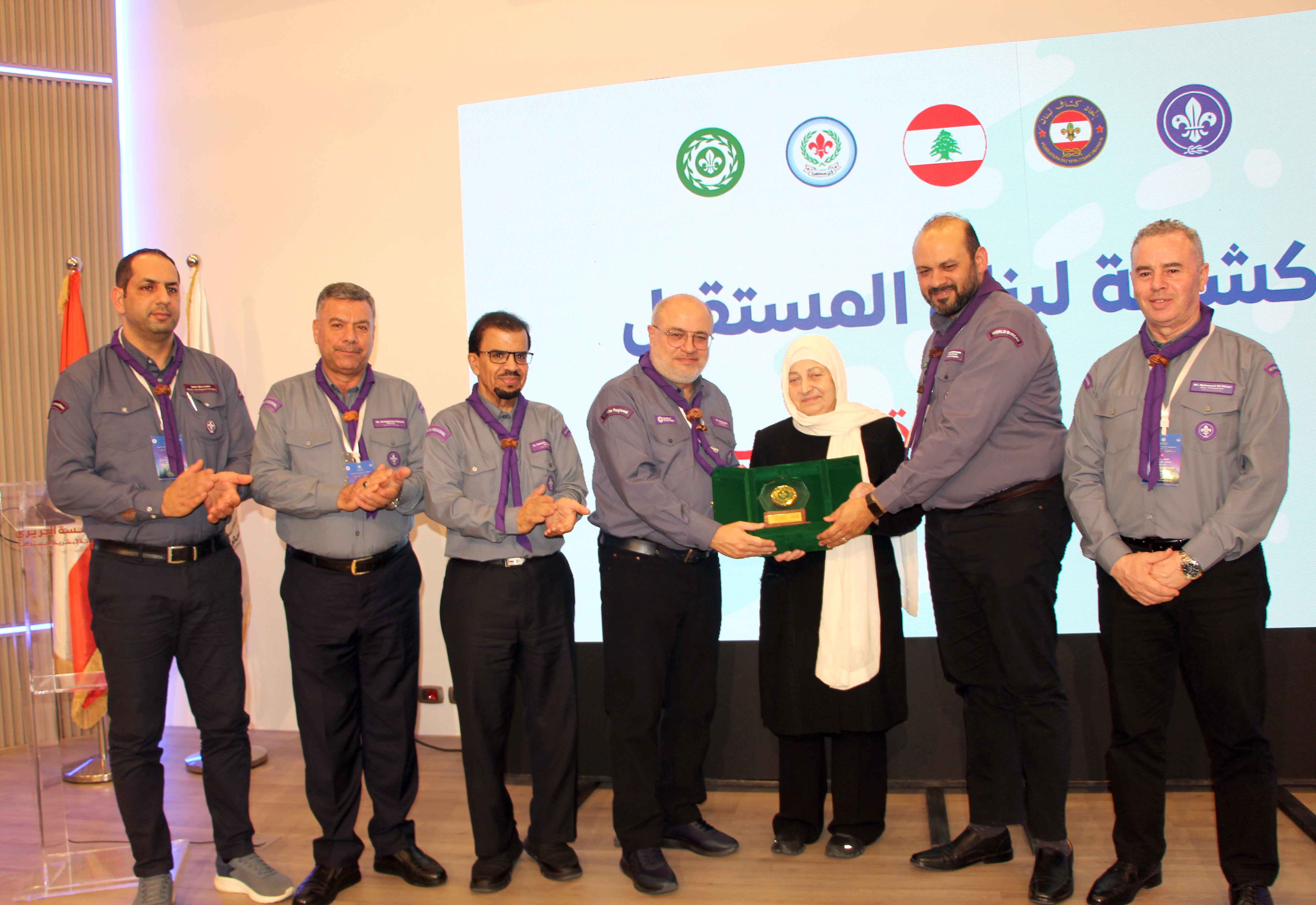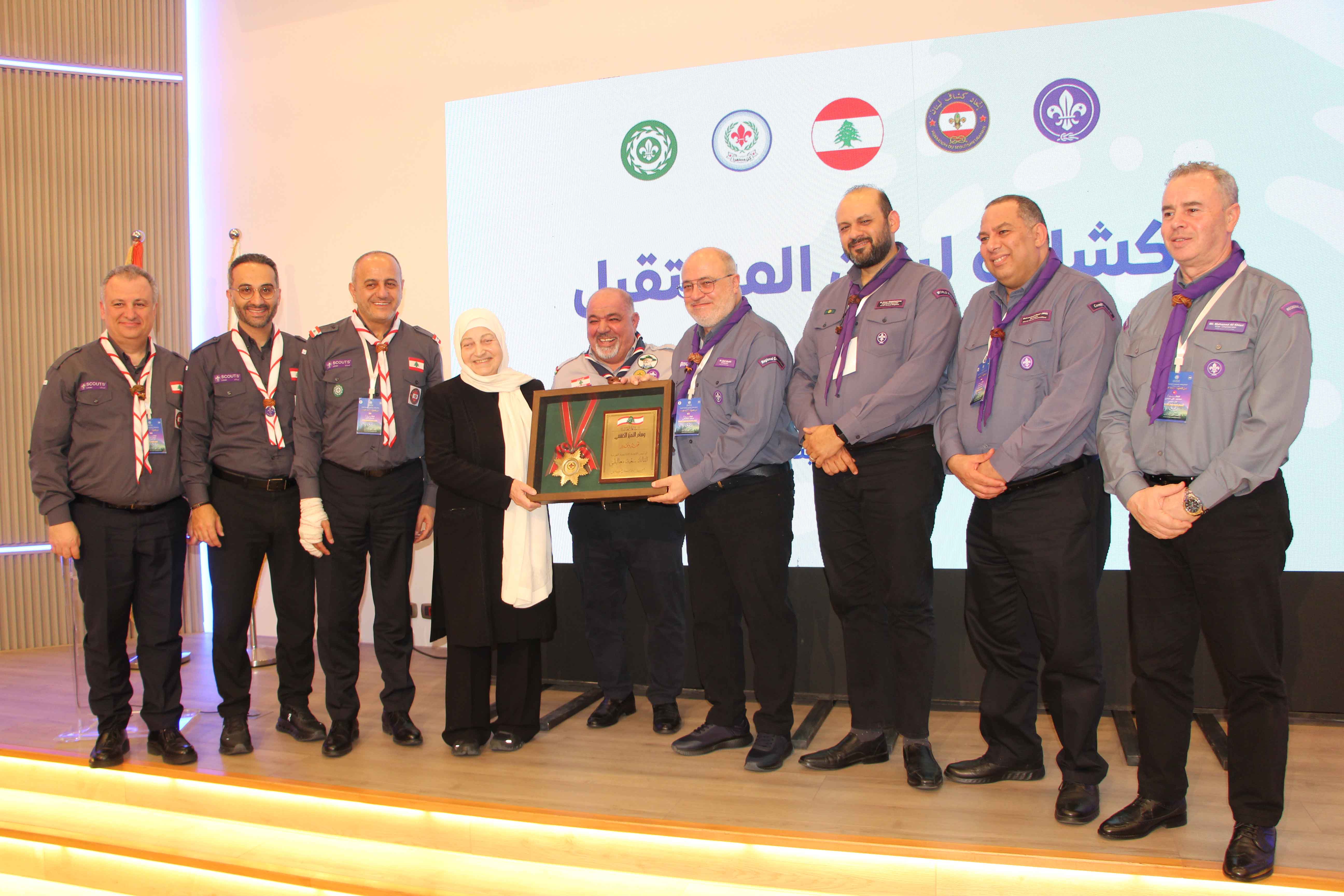 بعد ذلك قدم معاليقي بمشاركة أمين عام المنظمة الكشفية العربية ونائب رئيس واعضاء اللجنة الكشفية العربية درع المنظمة التكريمي للسيدة الحريري .
