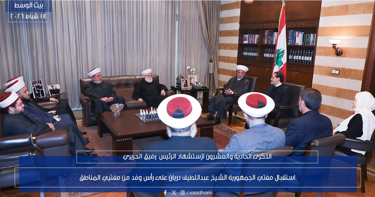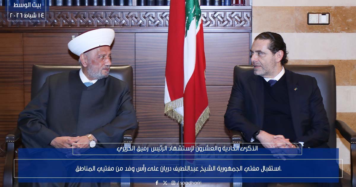 استقبل الرئيس سعد الحريري مفتي الجمهورية الشيخ عبداللطيف دريان على رأس وفد من مفتيي المناطق، في حضور رئيسة مؤسسة الحريري للتنمية البشرية المستدامة بهية الحريري ومستشار الرئيس الحريري للشؤون الإسلامية الشيخ علي الجناني.