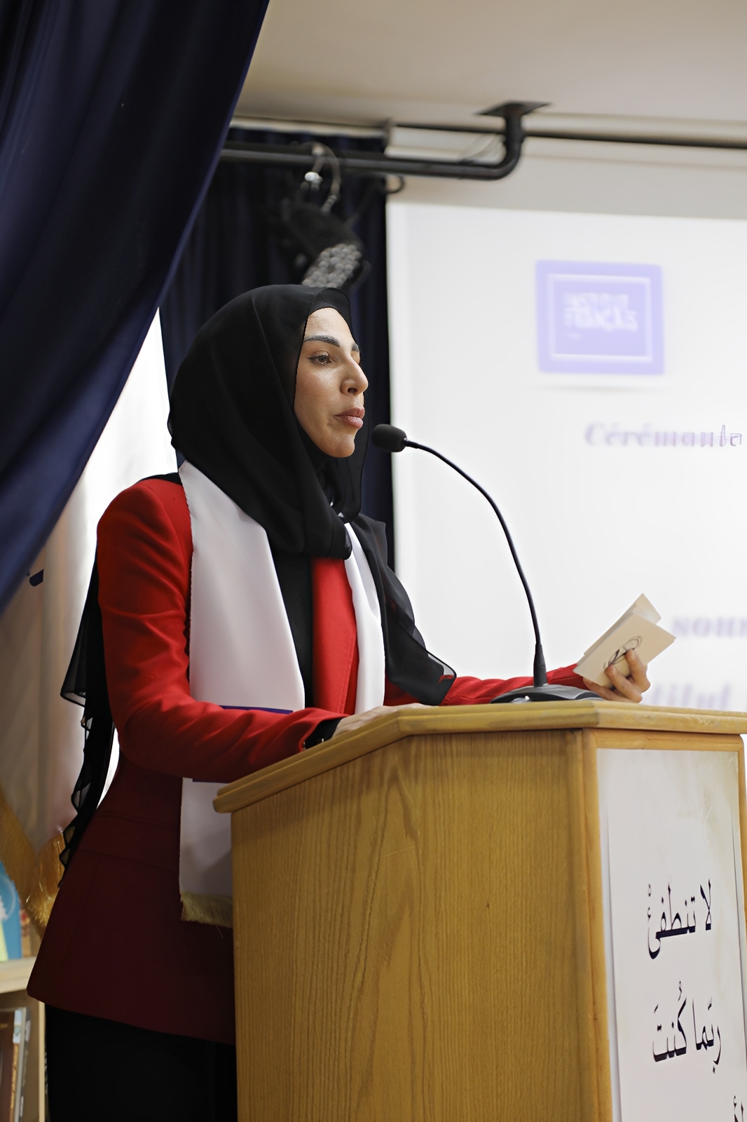 افتتح الاحتفال بالنشيد الوطني ونشيد السّفير، وتقديم من الأستاذة جميلة عكوش رحبت فيه بممثلة المركز الثقافي الفرنسي، وشكرت أولياء الأمور لحضورهم معتبرة أن "دعمهم المتواصل كان له دورٌ بالغ الأهمية في نجاح أبنائهم، الذين بذلوا جهدًا ووقتًا كبيرين لنيل هذه الشهادة، التي تُعدّ بمثابة جواز سفر أكاديمي حقيقي لهم، فضلًا عن كونها اعترافًا دوليًّا بمهاراتهم في اللغة الفرنسية".