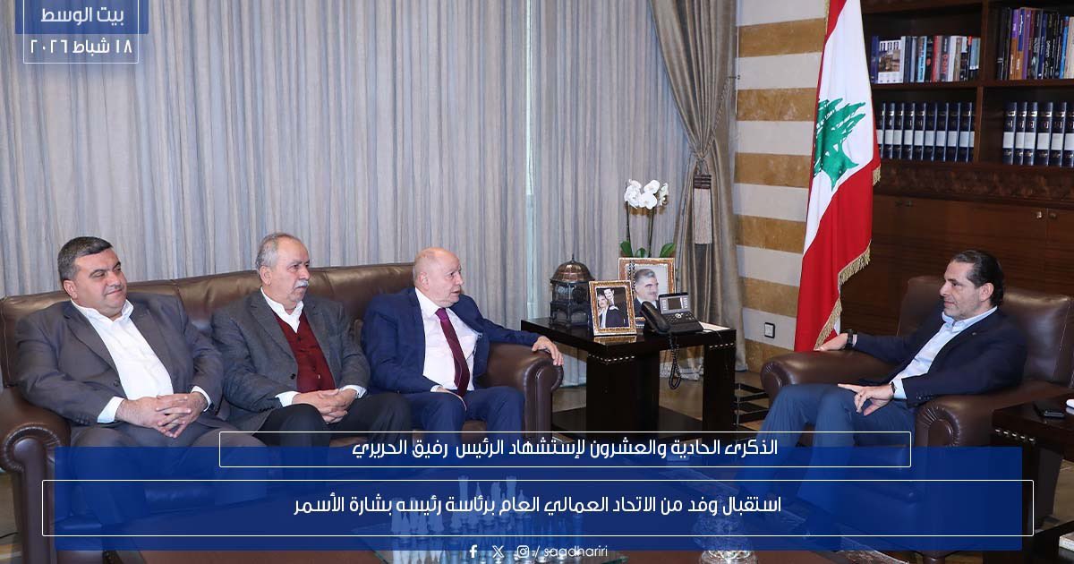 استقبل الرئيس سعد الحريري بعد ظهر اليوم في "بيت الوسط" وفدا من الاتحاد العمالي العام برئاسة رئيس الاتحاد بشارة الأسمر، في حضور نائبة رئيس تيار المستقبل بهية الحريري والمستشار غطاس خوري.