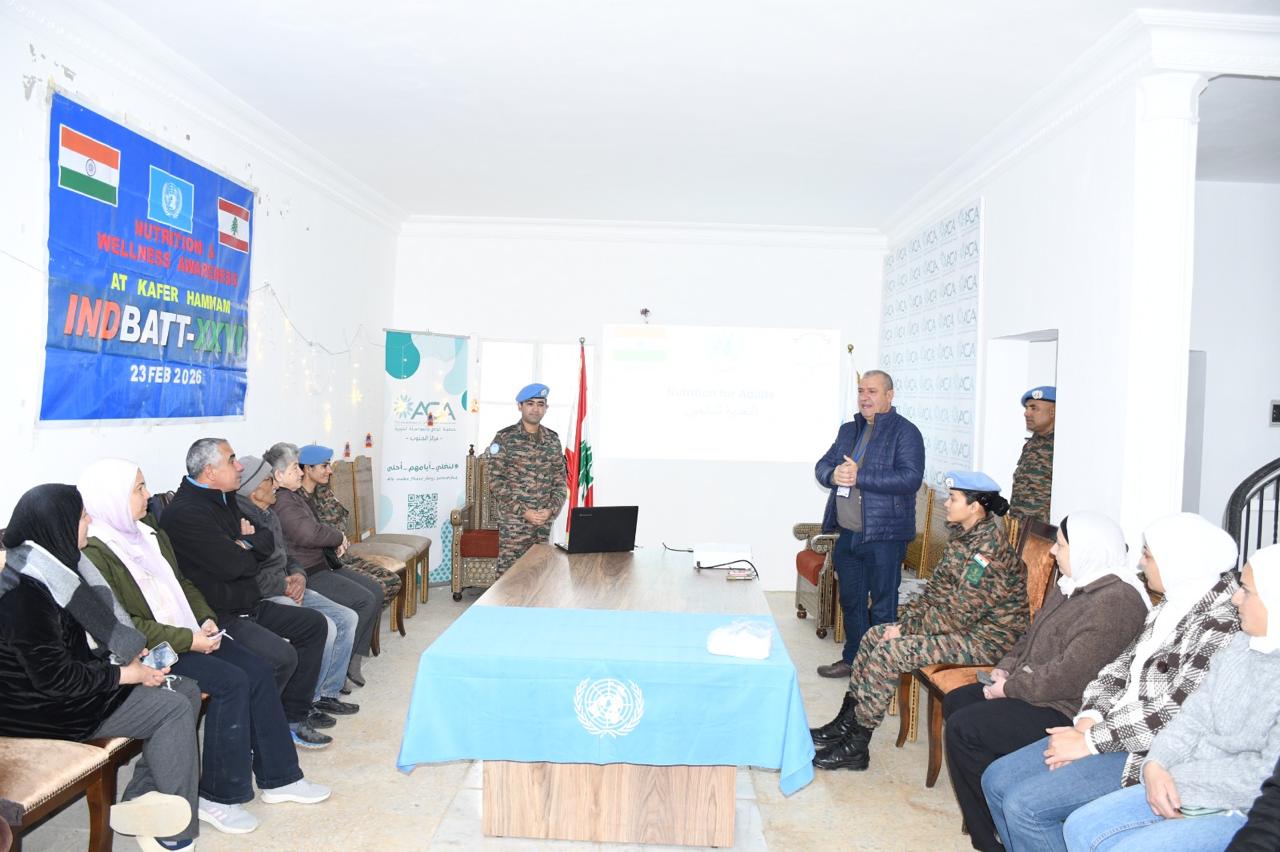 في إطار تعزيز صحة المجتمع من خلال المعرفة المحلية، نظّمت الكتيبة الهندية السادسة والعشرون العاملة ضمن قوات حفظ السلام المؤقتة في لبنان (اليونيفيل)، بالتعاون مع جمعية الوعي والمؤاساة الخيرية (ACA)، ورشة توعوية تفاعلية حول التغذية في بلدة كفرحمام. وجمعت الجلسة 22 سيدة من المجتمع المحلي ضمن برنامج تفاعلي استمر لساعتين.