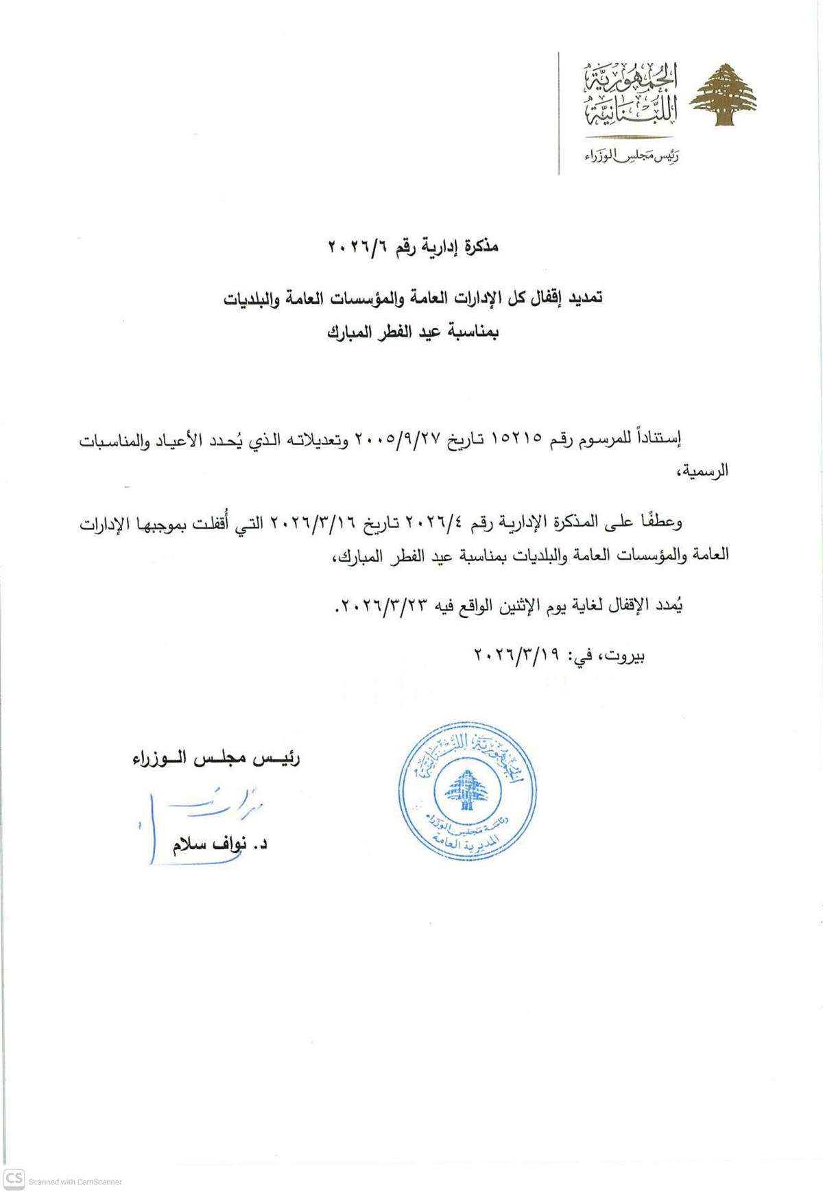 صدر عن رئاسة مجلس الوزراء مذكرة رقم 2026/6، تقضي بتمديد إقفال جميع الإدارات والمؤسسات العامة والبلديات، وذلك بمناسبة حلول عيد الفطر المبارك.