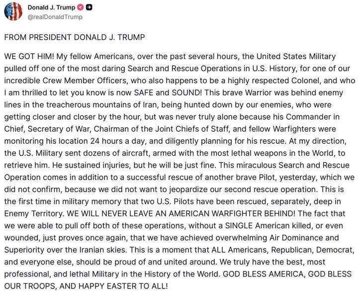 وأضاف: "على مدار الساعات القليلة الماضية، نفّذ الجيش الأميركي واحدة من أجرأ عمليات البحث والإنقاذ في تاريخ الولايات المتحدة"، مشيراً إلى أن العملية شملت "عشرات الطائرات، المُجهزة بأكثر الأسلحة فتكاً في العالم"، وأن القوات الإيرانية كانت تلاحق الطيار.