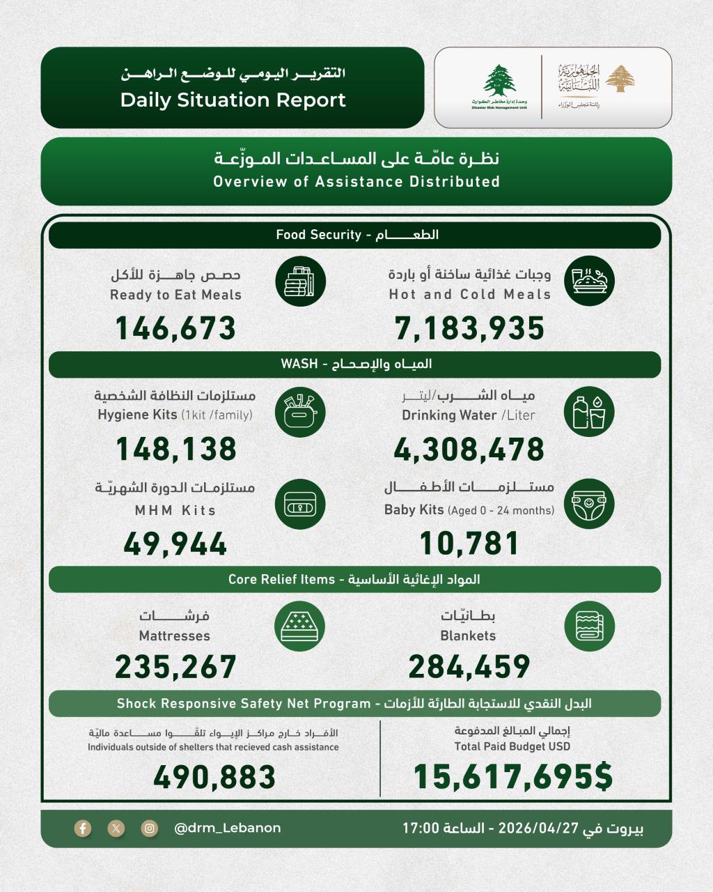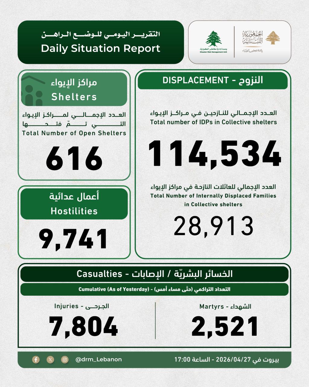 التقرير اليومي للوضع الراهن، والصادر عن "وحدة إدارة مخاطر الكوارث" في السراي الكبير.