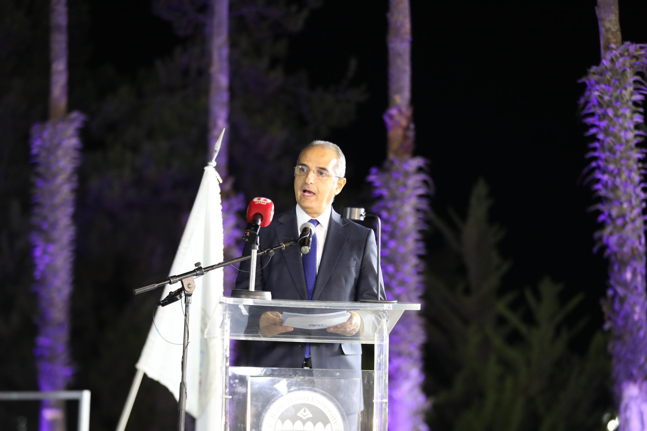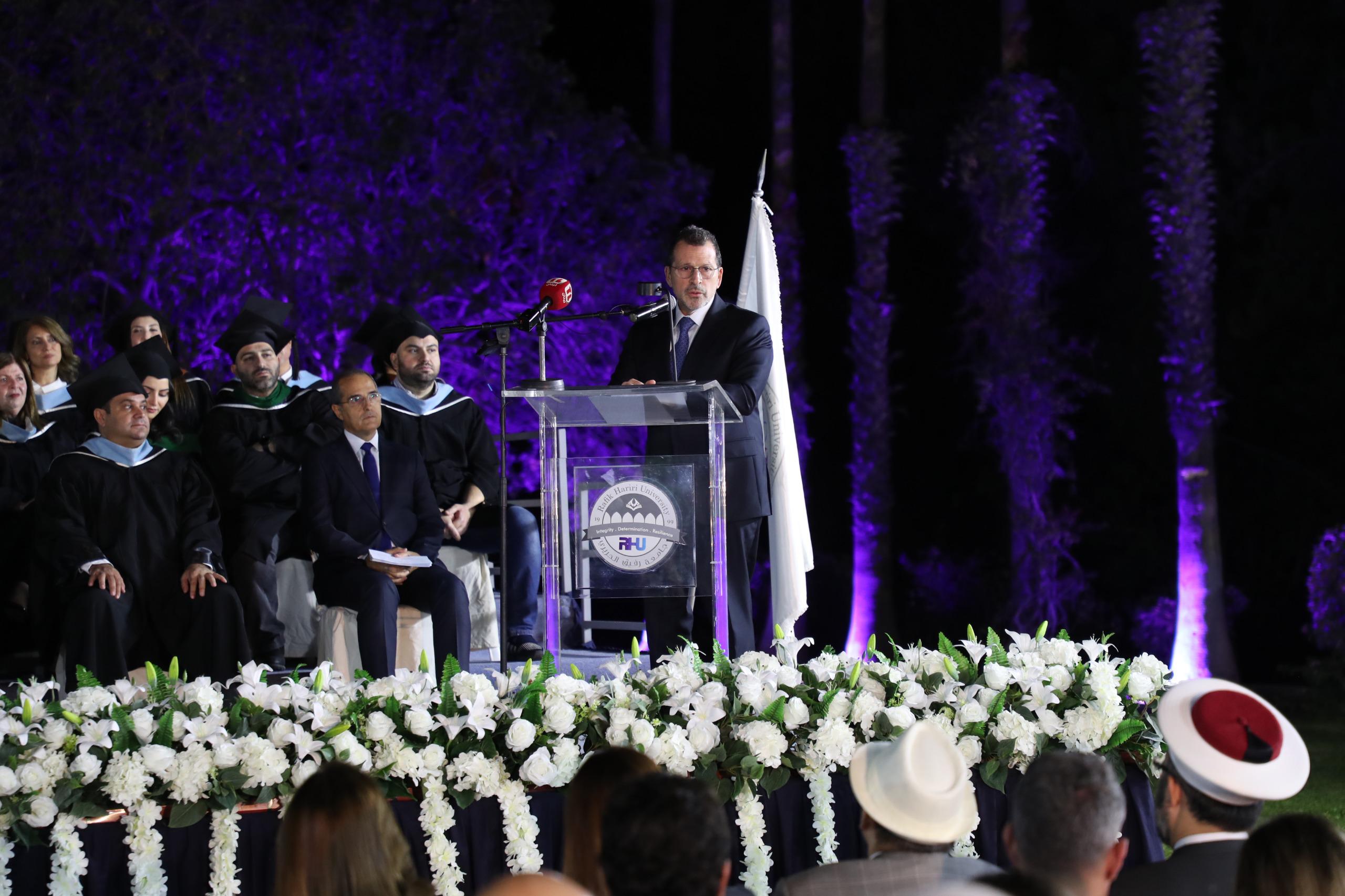 وأثنى المتحدث الرئيس للحفل، وزير المهجرين ووزير الدولة لشؤون تكنولوجيا المعلومات والذكاء الاصطناعي، الدكتور كمال شحادة، على إرث الرئيس الشهيد رفيق الحريري، واصفاً إياه بأنه “رجل الرؤية الذي آمن بأن التعليم هو الأساس في بناء الإنسان والوطن.” وأشاد الوزير شحادة بجامعة رفيق الحريري “التي واصلت هذه الرسالة النبيلة بمسؤولية وتميّز، لتقف اليوم صرحاً علمياً راسخاً ومنارةً للابتكار والتجدد الوطني.”