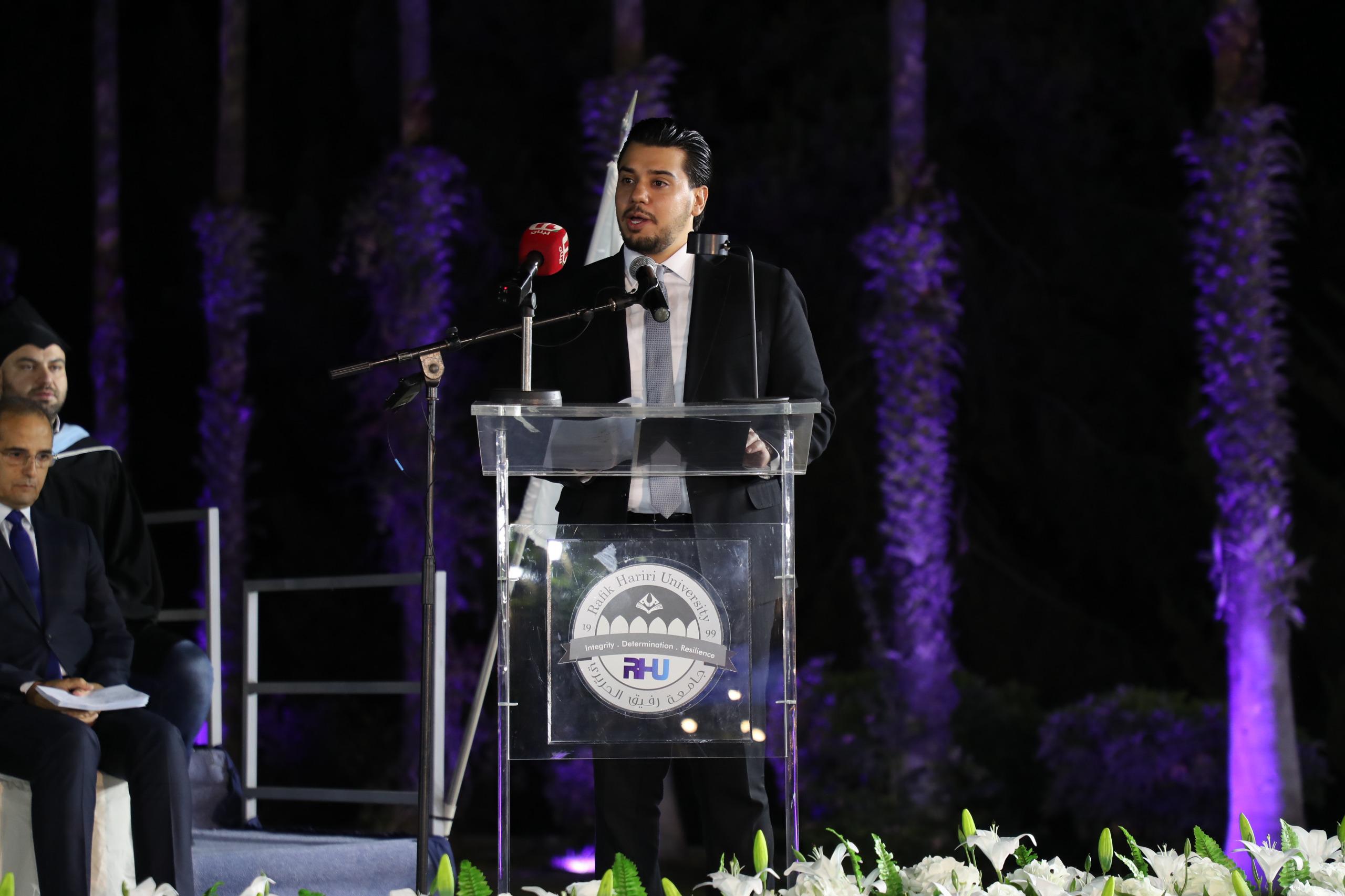 كما ألقى الخريج بكر الحلّاوي، وهو مدير في شركة KPMG في الشرق الأوسط، كلمةً شارك فيها تجربته الشخصية، قائلاً: “العودة إلى جامعة رفيق الحريري ليست زيارة، بل عودة إلى البيت الذي شكّل شخصيتي ومساري. خمسة وعشرون عاماً من التميز ليست مجرد رقم، بل قصة نجاح بُنيت على رؤية رجلٍ عظيم آمن بأن التعليم هو طريق الأمل وبناء الوطن.”
