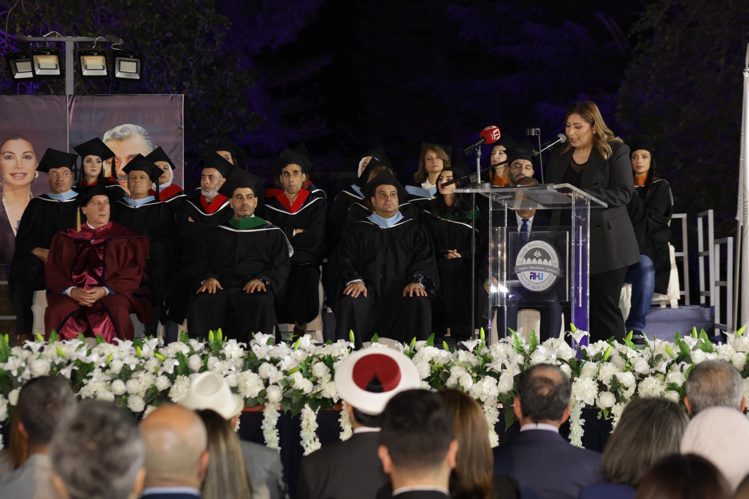 استُهل الحفل الذي تولّى تقديمه الإعلامي يزبك وهبي بالنشيد الوطني اللبناني ونشيد الجامعة، تلاه عرض فيلم وثائقي بعنوان “جامعة رفيق الحريري، إرث متجدد”، يجسّد مسيرة الجامعة على مدى خمسةٍ وعشرين عاماً، ويُبرز إنجازاتها الأكاديمية وتطورها المستمر ورؤيتها المستقبلية.