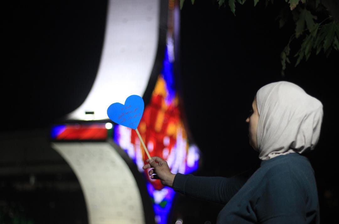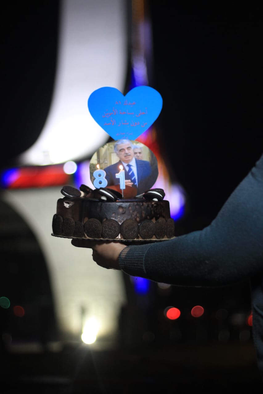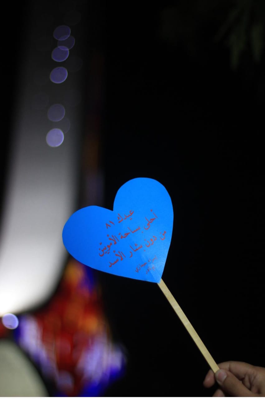 أحيت الناشطة إسراء حجازي، عيد ميلاد الرئيس الشهيد رفيق الحريري الـ 81، بطريقة لافتة، في قلب ساحة الامويين في العاصمة السورية دمشق، حيث حملت قالب حلوى مضاء بالشموع وتتوسطه صورة الرئيس الشهيد وقلب أزرق مع عبارة "عيدك الـ 81 .. أحلى بساحة الأمويين من دون بشار الأسد".